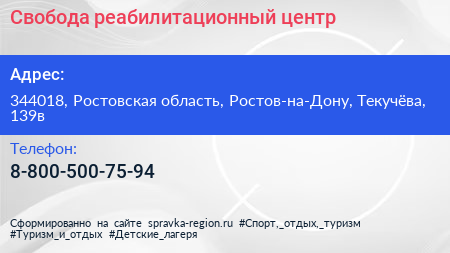 Свобода, реабилитационный центр по адресу 344018, Ростовская область, Ростов-на-Дону, Текучёва, 139в в дальнейшем Организация, размещена в следующих категориях: