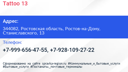 Tattoo 13 по адресу 344082, Ростовская область, Ростов-на-Дону, Станиславского, 13 в дальнейшем Организация, размещена в следующих категориях: