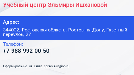 Учебный центр Эльмиры Ишхановой по адресу 344002, Ростовская область, Ростов-на-Дону, Газетный переулок, 27 в дальнейшем Организация, размещена в следующих категориях: