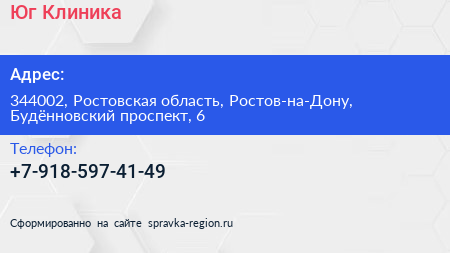 Юг-Клиника по адресу 344002, Ростовская область, Ростов-на-Дону, Будённовский проспект, 6 в дальнейшем Организация, размещена в следующих категориях: