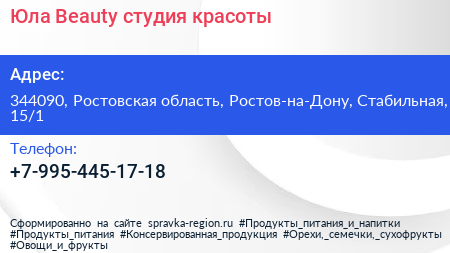 Юла Beauty, студия красоты по адресу 344090, Ростовская область, Ростов-на-Дону, Стабильная, 15/1 в дальнейшем Организация, размещена в следующих категориях: