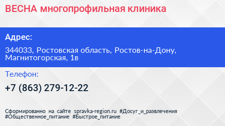 ВЕСНА, многопрофильная клиника по адресу 344033, Ростовская область, Ростов-на-Дону, Магнитогорская, 1в в дальнейшем Организация, размещена в следующих категориях: