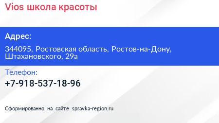 Vios, школа красоты по адресу 344095, Ростовская область, Ростов-на-Дону, Штахановского, 29а в дальнейшем Организация, размещена в следующих категориях: