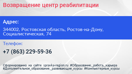 Возвращение, центр реабилитации по адресу 344002, Ростовская область, Ростов-на-Дону, Социалистическая, 74 в дальнейшем Организация, размещена в следующих категориях: