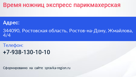 Время ножниц, экспресс-парикмахерская по адресу 344090, Ростовская область, Ростов-на-Дону, Жмайлова, 4/4 в дальнейшем Организация, размещена в следующих категориях: