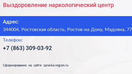 Выздоровление, наркологический центр по адресу 344004, Ростовская область, Ростов-на-Дону, Мадояна, 77 в дальнейшем Организация, размещена в следующих категориях: