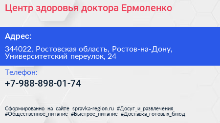 Центр здоровья доктора Ермоленко по адресу 344022, Ростовская область, Ростов-на-Дону, Университетский переулок, 24 в дальнейшем Организация, размещена в следующих категориях: