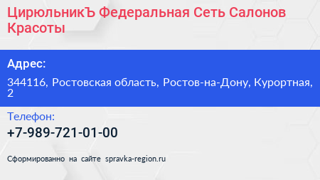 ЦирюльникЪ, Федеральная Сеть Салонов Красоты по адресу 344116, Ростовская область, Ростов-на-Дону, Курортная, 2 в дальнейшем Организация, размещена в следующих категориях: