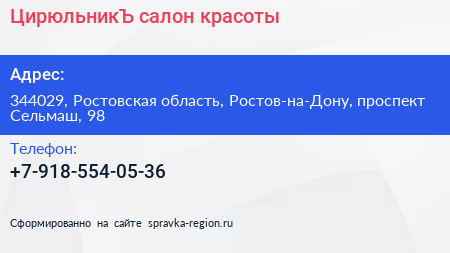 ЦирюльникЪ, салон красоты по адресу 344029, Ростовская область, Ростов-на-Дону, проспект Сельмаш, 98 в дальнейшем Организация, размещена в следующих категориях: