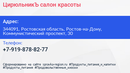 ЦирюльникЪ, салон красоты по адресу 344091, Ростовская область, Ростов-на-Дону, Коммунистический проспект, 30 в дальнейшем Организация, размещена в следующих категориях: