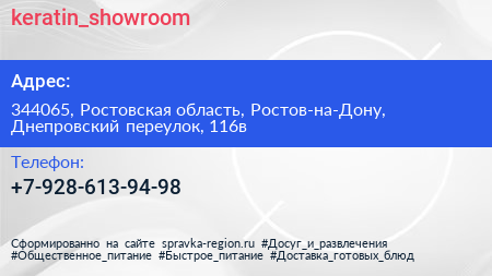 keratin_showroom по адресу 344065, Ростовская область, Ростов-на-Дону, Днепровский переулок, 116в в дальнейшем Организация, размещена в следующих категориях: