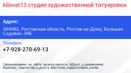 kilovat13, студия художественной татуировки по адресу 344082, Ростовская область, Ростов-на-Дону, Большая Садовая, 34Б в дальнейшем Организация, размещена в следующих категориях: