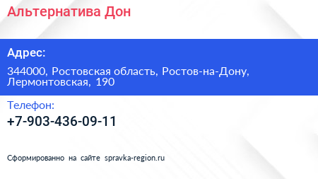 Альтернатива-Дон по адресу 344000, Ростовская область, Ростов-на-Дону, Лермонтовская, 190 в дальнейшем Организация, размещена в следующих категориях: