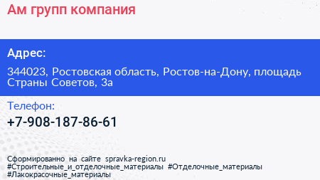 Ам-групп, компания по адресу 344023, Ростовская область, Ростов-на-Дону, площадь Страны Советов, 3а в дальнейшем Организация, размещена в следующих категориях: