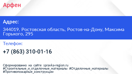 Арфен по адресу 344019, Ростовская область, Ростов-на-Дону, Максима Горького, 295 в дальнейшем Организация, размещена в следующих категориях: