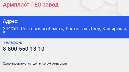 Армпласт-ГЕО, завод по адресу 344091, Ростовская область, Ростов-на-Дону, Каширская, 5 в дальнейшем Организация, размещена в следующих категориях: