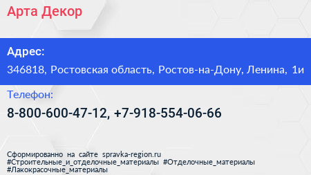 Арта Декор по адресу 346818, Ростовская область, Ростов-на-Дону, Ленина, 1и в дальнейшем Организация, размещена в следующих категориях: