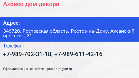 Azdeco, дом декора по адресу 346720, Ростовская область, Ростов-на-Дону, Аксайский проспект, 21 в дальнейшем Организация, размещена в следующих категориях: