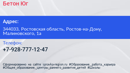 Бетон Юг по адресу 344033, Ростовская область, Ростов-на-Дону, Малиновского, 1а в дальнейшем Организация, размещена в следующих категориях: