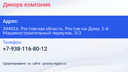 Динора, компания по адресу 344016, Ростовская область, Ростов-на-Дону, 1-й Машиностроительный переулок, 3/3 в дальнейшем Организация, размещена в следующих категориях: