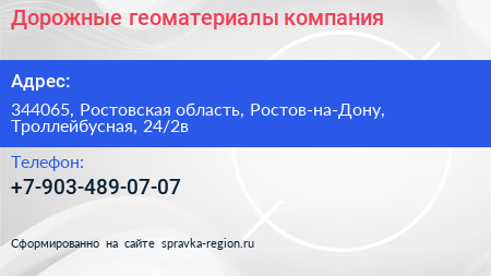 Дорожные геоматериалы, компания по адресу 344065, Ростовская область, Ростов-на-Дону, Троллейбусная, 24/2в в дальнейшем Организация, размещена в следующих категориях: