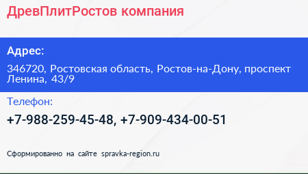 ДревПлитРостов, компания по адресу 346720, Ростовская область, Ростов-на-Дону, проспект Ленина, 43/9 в дальнейшем Организация, размещена в следующих категориях: