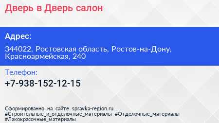 Дверь в Дверь, салон по адресу 344022, Ростовская область, Ростов-на-Дону, Красноармейская, 240 в дальнейшем Организация, размещена в следующих категориях: