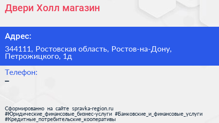 Двери Холл, магазин по адресу 344111, Ростовская область, Ростов-на-Дону, Петрожицкого, 1д в дальнейшем Организация, размещена в следующих категориях: