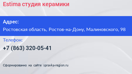 Estima, студия керамики по адресу Ростовская область, Ростов-на-Дону, Малиновского, 98 в дальнейшем Организация, размещена в следующих категориях: