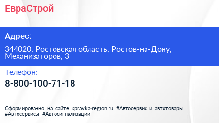 ЕвраСтрой по адресу 344020, Ростовская область, Ростов-на-Дону, Механизаторов, 3 в дальнейшем Организация, размещена в следующих категориях: