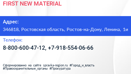 FIRST NEW MATERIAL по адресу 346818, Ростовская область, Ростов-на-Дону, Ленина, 1и в дальнейшем Организация, размещена в следующих категориях: