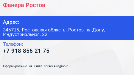 Фанера-Ростов по адресу 346715, Ростовская область, Ростов-на-Дону, Индустриальная, 22 в дальнейшем Организация, размещена в следующих категориях: