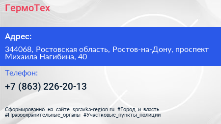 ГермоТех по адресу 344068, Ростовская область, Ростов-на-Дону, проспект Михаила Нагибина, 40 в дальнейшем Организация, размещена в следующих категориях: