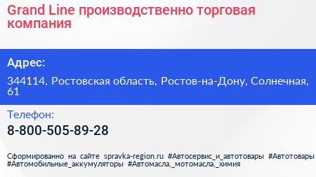 Grand Line, производственно-торговая компания по адресу 344114, Ростовская область, Ростов-на-Дону, Солнечная, 61 в дальнейшем Организация, размещена в следующих категориях: