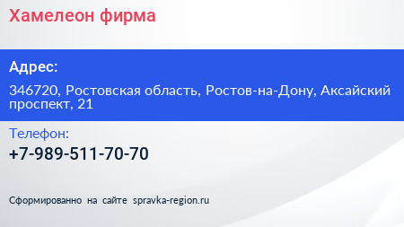 Хамелеон, фирма по адресу 346720, Ростовская область, Ростов-на-Дону, Аксайский проспект, 21 в дальнейшем Организация, размещена в следующих категориях: