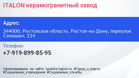 ITALON, керамогранитный завод по адресу 344000, Ростовская область, Ростов-на-Дону, переулок Семашко, 114 в дальнейшем Организация, размещена в следующих категориях: