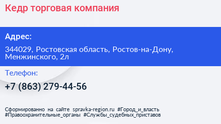 Кедр, торговая компания по адресу 344029, Ростовская область, Ростов-на-Дону, Менжинского, 2л в дальнейшем Организация, размещена в следующих категориях:
