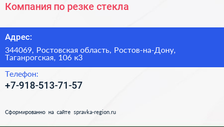 Компания по резке стекла по адресу 344069, Ростовская область, Ростов-на-Дону, Таганрогская, 106 к3 в дальнейшем Организация, размещена в следующих категориях:
