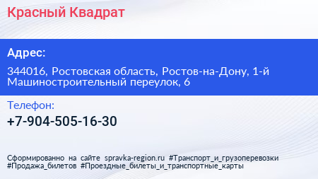 Красный Квадрат по адресу 344016, Ростовская область, Ростов-на-Дону, 1-й Машиностроительный переулок, 6 в дальнейшем Организация, размещена в следующих категориях: