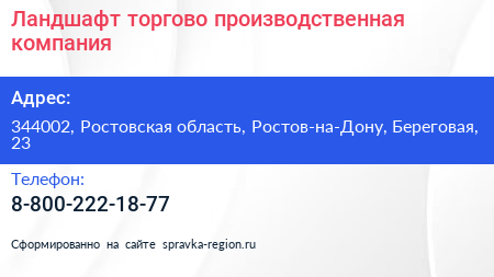 Ландшафт, торгово-производственная компания по адресу 344002, Ростовская область, Ростов-на-Дону, Береговая, 23 в дальнейшем Организация, размещена в следующих категориях: