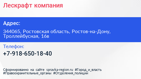 Лескрафт, компания по адресу 344065, Ростовская область, Ростов-на-Дону, Троллейбусная, 16в в дальнейшем Организация, размещена в следующих категориях: