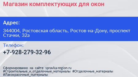 Магазин комплектующих для окон по адресу 344004, Ростовская область, Ростов-на-Дону, проспект Стачки, 32а в дальнейшем Организация, размещена в следующих категориях: