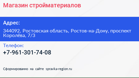 Магазин стройматериалов по адресу 344092, Ростовская область, Ростов-на-Дону, проспект Королёва, 7/3 в дальнейшем Организация, размещена в следующих категориях: