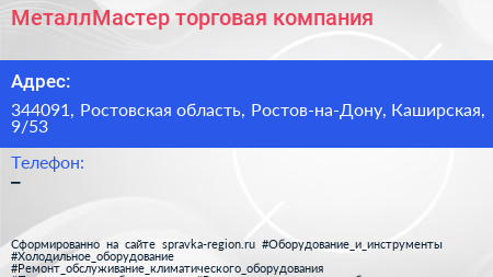 МеталлМастер, торговая компания по адресу 344091, Ростовская область, Ростов-на-Дону, Каширская, 9/53 в дальнейшем Организация, размещена в следующих категориях: