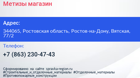 Метизы, магазин по адресу 344065, Ростовская область, Ростов-на-Дону, Вятская, 77/2 в дальнейшем Организация, размещена в следующих категориях: