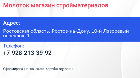 Молоток, магазин стройматериалов по адресу Ростовская область, Ростов-на-Дону, 10-й Лазоревый переулок, 1 в дальнейшем Организация, размещена в следующих категориях: