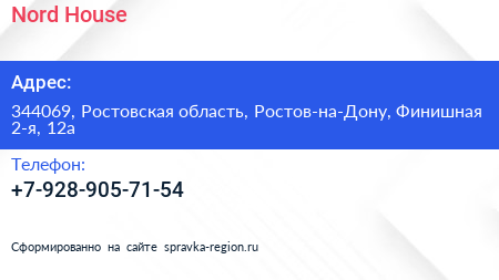 Nord House по адресу 344069, Ростовская область, Ростов-на-Дону, Финишная 2-я, 12а в дальнейшем Организация, размещена в следующих категориях: