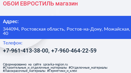 ОБОИ ЕВРОСТИЛЬ, магазин по адресу 344094, Ростовская область, Ростов-на-Дону, Можайская, 40 в дальнейшем Организация, размещена в следующих категориях: