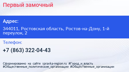 Первый замочный по адресу 344011, Ростовская область, Ростов-на-Дону, 1-й переулок, 2 в дальнейшем Организация, размещена в следующих категориях: