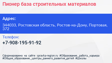 Пионер, база строительных материалов по адресу 344033, Ростовская область, Ростов-на-Дону, Портовая, 372 в дальнейшем Организация, размещена в следующих категориях: